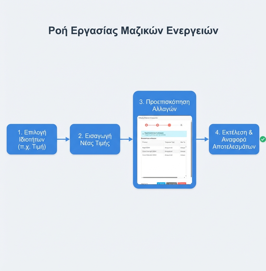 - Υποχρεωτική Προεπισκόπηση: Πριν εκτελεστεί οποιαδήποτε αλλαγή, το σύστημα σας δείχνει μια αναλυτική προεπισκόπηση με το “Πριν” και το “Μετά” για κάθε είδος που έχετε επιλέξει. Έτσι, είστε πάντα σίγουροι για το αποτέλεσμα.